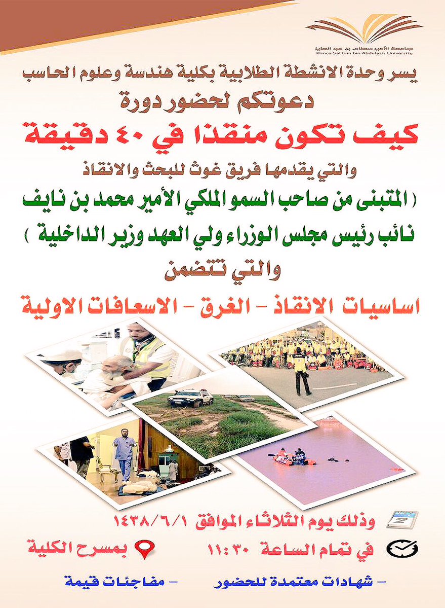فبراير 28 2017 By صفيه عبده الناشري #فريق_غوث يقدم دورة بجامعة #الأمير_سطام_بن_عبدالعزيز دورة بعنوان "كيف تكون منقذاً في ٤٠ دقيقة" #الرياض #الخرج أوسمة: #الفرسان #المنطقة_الشرقية #غوث #الرياض #الدمام #الشرقيه #الغربيه #جده #عمليات_انقاذ #تطوع #بلاغات #الاسعافات #فريق_غوث