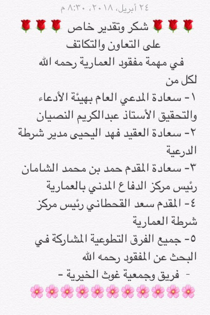 تتقدم جمعية غوث للتوعية من الأخطار والكوارث و فريق غوث للبحث والإنقاذ بعظيم الشكر والأمتنان لكل من تعاون وسهل أمر مهمة مفقود العمارية رحمه الله رحمه واسعه وأدخله فسيح جناته وتخص بذلك كل من :